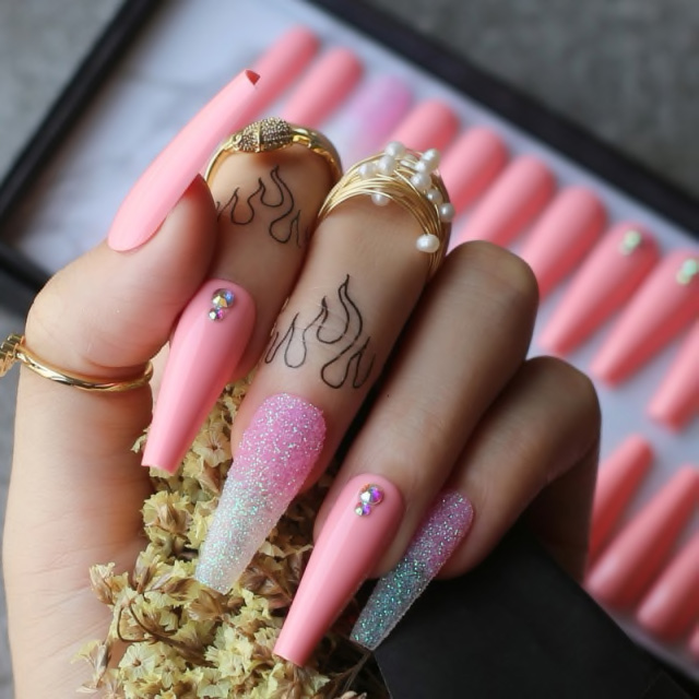 Coffin Shaped Press-On Nails with Glitter & Crystals